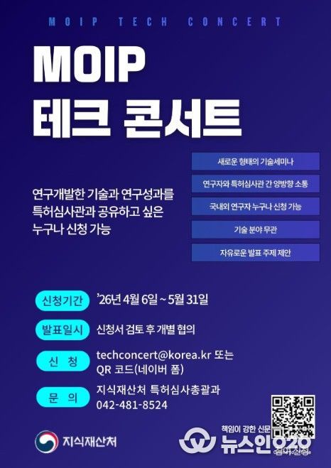 (뉴스인020 = 김나현 기자) 지식재산처는 4월 6일~5월 31일까지 기업 및 연구소가 개발하거나 연구한 최신 기술을 특허심사관과 공유하고, 연구자와 특허심사관과의 직접적인 소통을 강화하기 위한 ‘지식재산처(MOIP) 기술 공연(MOIP Tech Concert)'에 참여할 우수 연구자를 모집한다고 밝혔다.