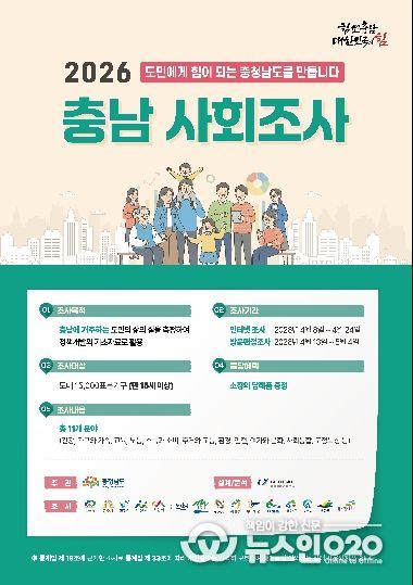 (뉴스인020 = 김성길 기자) 충남도는 오는 8일부터 5월 4일까지 도내 1만 5000가구를 대상으로 ‘2026 충남 사회조사’를 실시한다고 7일 밝혔다.