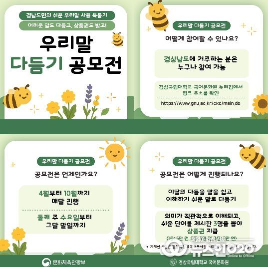 (뉴스인020 = 김성길 기자) 경상국립대학교 국어문화원은 어려운 외국어·외래어·한자어 등을 쉬운 우리말로 다듬어 보는 ‘우리말 다듬기 공모전’을 개최한다.
