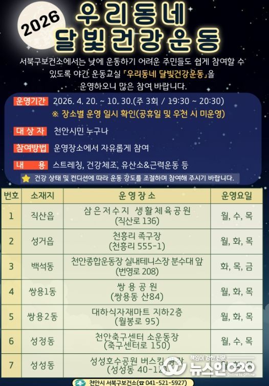 (뉴스인020 = 김성길 기자) 천안시는 오는 20일부터 10월 30일까지 ‘우리동네 달빛건강운동’을 운영한다고 10일 밝혔다.