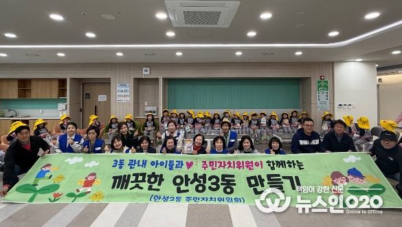 (뉴스인020 = 김성길 기자) 안성시 안성3동 주민자치위원회는 지난 9일, 관내 어린이들과 함께 올해 주민자치 특색사업인 ‘깨끗한 안성3동 만들기’의 시작을 알리는 의미 있는 시간을 가졌다고 밝혔다.