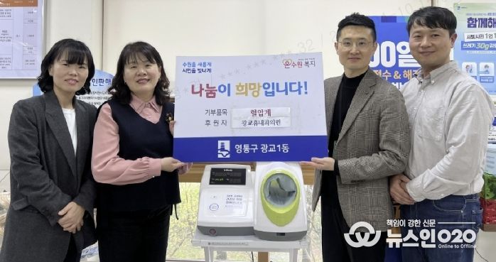 (뉴스인020 = 김성길 기자) 수원시 영통구 광교1동은 지난 10일 광교휴내과의원으로부터 혈압계 1대를 기부받아 행정복지센터에 비치했다고 밝혔다.