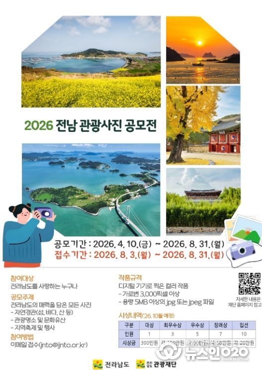 (뉴스인020 = 김성길 기자) 전라남도는 자연경관과 관광지, 축제 등 지역의 다양한 매력을 널리 알리고 수준 높은 사진 콘텐츠를 발굴하기 위해 ‘2026년 전남 관광사진 공모전’을 추진한다.