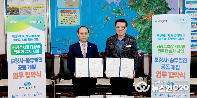 (뉴스인020 = 김성길 기자) 보령시는 지난 13일 보령시청 시장실에서 한국중부발전과 ‘공공주차장 태양광 의무화 설치사업’ 공동개발을 위한 업무협약(MOU)을 체결했다고 밝혔다.
