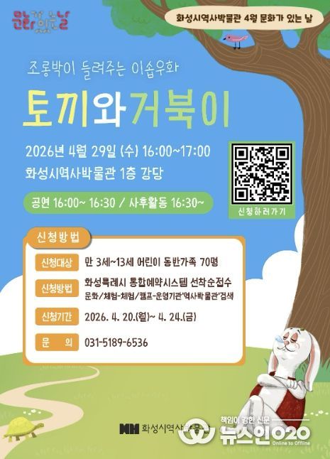 (뉴스인020 = 김성길 기자) 화성특례시 역사박물관은 오는 4월 29일 ‘문화가 있는 날’을 맞아 어린이와 가족을 위한 체험형 공연 프로그램을 운영한다.
