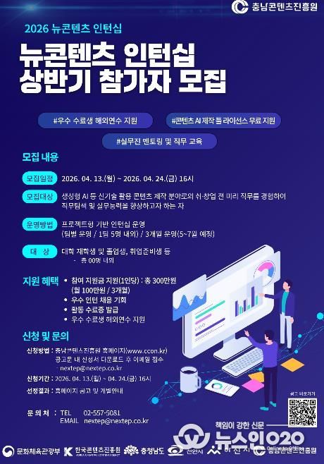 (뉴스인020 = 김성길 기자) 충남콘텐츠진흥원은 도내 콘텐츠 산업 인재 양성과 일자리 창출을 위해 ‘2026 뉴콘텐츠 인턴십’ 상반기 참가자를 모집한다고 밝혔다.