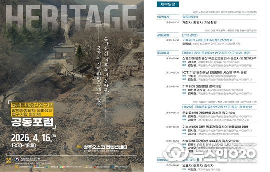 (뉴스인020 = 김성길 기자) 국립문화유산연구원-광역자치단체 문화유산 연구기관 협의체(경기문화재단경기역사문화유산원, 경남연구원경남학연구센터, 경북문화재단문화유산원, 전라남도문화재단국가유산연구소, 충남역사문화연구원, 충청북도역사문화연구원)는 2026년 4월 16일 수요일 「국가유산 기후위기 돌파구, 국가와 지역의 협력에서 찾다」를 주제로 청주 오스코에서 공동 포럼을 개최한다.