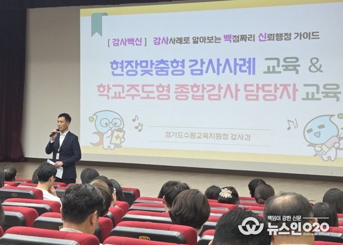 (뉴스인020 = 김성길 기자) 경기도수원교육지원청은 학교 현장의 행정 오류를 예방하고 청렴한 조직문화를 조성하기 위해 ‘2026년 [감사백신] 현장맞춤형 감사사례 교육 연간 운영 계획’을 기획하고, 그 첫걸음으로 2026. 4. 15.(수) 학교(주도형) 종합감사 수감교 대상 ‘현장맞춤형 감사사례 교육’을 성공적으로 마쳤다고 밝혔다.