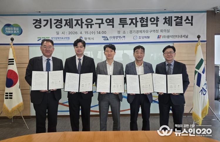 (뉴스인020 = 김성길 기자) 경기경제자유구역청은 15일 경기경제청 8층 회의실에서 평택시 및 자동차부품, 반도체, 화학 제조기업 5개사(㈜왕성이노텍, 조양메탈㈜, ㈜광석인터내셔날/그 외 2개 기업 서면 협약)와 평택 포승(BIX)지구 산업시설용지 투자협약을 체결했다.