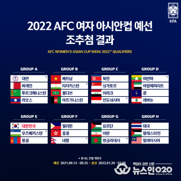 (뉴스인020 = 김민석 기자) 2022 AFC 여자 아시안컵 예선에서 한국이 우즈베키스탄, 몽골과 한 조에 속했다.