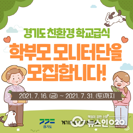 (뉴스인020 = 김성길 기자) 경기도와 경기도농수산진흥원이 오는 31일까지 ‘경기도 친환경 등 우수농산물 학교급식 학부모 모니터단’ 500명을 모집한다.