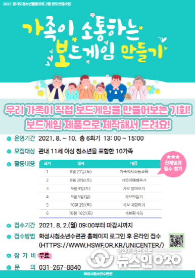 (뉴스인020 = 김성길 기자) 화성시청소년수련관(화성시여성가족청소년재단 운영)은 8월 2일부터 ‘가족이 소통하는 보드게임 만들기’ 프로그램 참가자를 모집한다. 2021년 경기도청소년공모사업에 선정된 ‘가보만들기’는 가족이 소통하며 보드게임을 만드는 활동으로 화목한 시간을 함께할 수 있는 가족 참여프로그램이다.