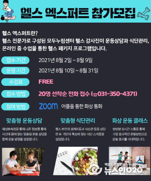 (뉴스인020 = 김성길 기자) 모두누림센터의 스포츠센터(화성시여성가족청소년재단 운영)에서는 오는 9일까지 온라인 운동 프로그램 ‘헬스 엑스퍼트(health expert)’의 참가자 20명을 선착순 모집한다.