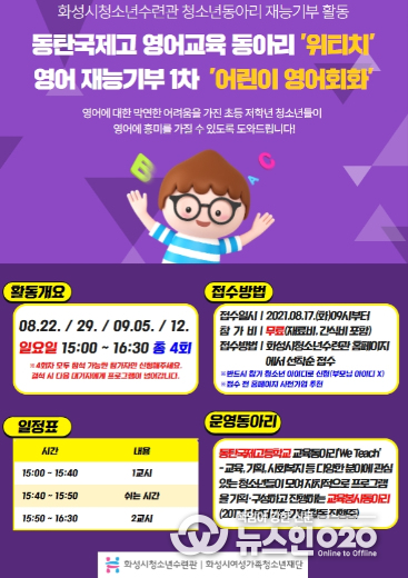 (뉴스인020 = 김성길 기자) 화성시청소년수련관(화성시여성가족청소년재단 운영)은 청소년 동아리 재능기부활동 ‘어린이 영어회화’에 참가할 초등학교 1~3학년 15명을 오는 8월 17일부터 선착순 모집한다.