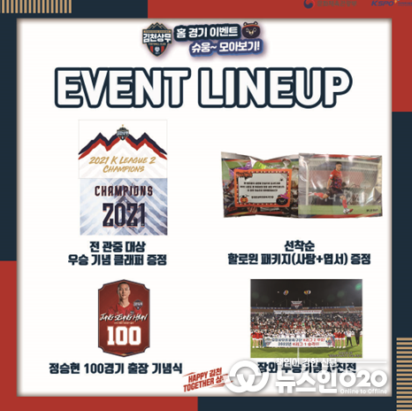 (뉴스인020 = 김민석 기자) 김천상무프로축구단이 31일 오후 3시 김천종합운동장에서 ‘하나원큐 K리그2 2021’ 36R 부산아이파크와 홈경기를 치른다. 올 시즌 마지막 홈경기 부산전에서도 김천은 팬들을 위한 다양한 이벤트를 진행할 예정이다.