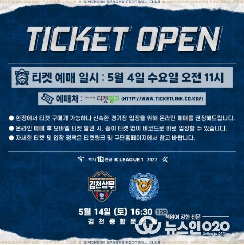 김천상무프로축구단(대표이사 배낙호)이 4일 오전 11시, 온라인 예매 사이트 티켓링크를 통해 14일 오후 4시 30분, 김천종합운동장에서 열리는 ‘하나원큐 K리그1 2022’ 12R 대구FC와 홈경기 티켓 예매를 시작한다.
