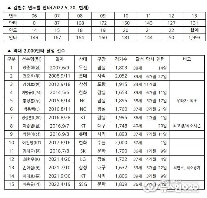 또한, 김현수는 데뷔 3년차였던 2008시즌부터 2021시즌까지(2016, 2017 해외진출) 12시즌 동안 세 자릿수 안타를 기록했다. 2,000안타와 더불어 13시즌 연속 세 자릿수 안타에 도전하는 김현수가 올 시즌에도 기록을 이어갈 수 있을지 관심이 모아진다.