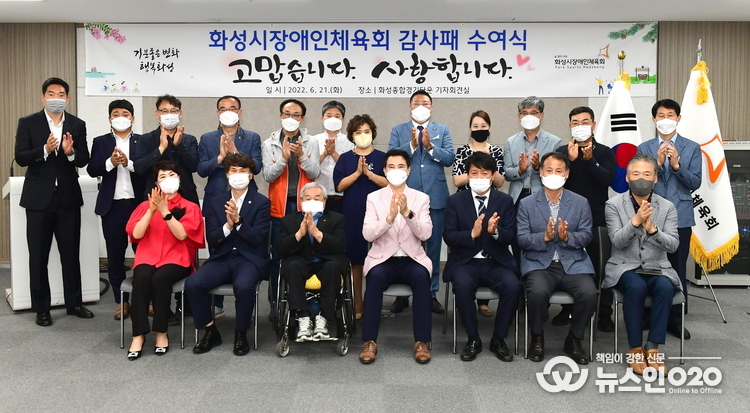 (뉴스인020 = 김성길 기자) 화성종합경기타운 기자회견실(1층)에서 지난 21일 화성시장애인체육회 감사패 전달식을 가졌다.