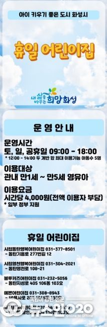 (뉴스인020 = 김성길 기자) 화성시가 1일부터 ‘휴일 어린이집’을 운영한다.