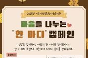 (뉴스인020 = 김성길 기자) 시흥시장곡종합사회복지관은 연말을 맞아 지역사회에 따뜻한 마음을 전하기 위한 ‘마음을 나누는 한 마디’ 캠페인을 진행한다. 이번 캠페인은 이웃을 향한 응원의 말, 위로의 말, 사랑의 말을 담은 짧은 문장을 시민들로부터 응모 받아 서로에게 위로와 용기를 건네는 나눔의 장을 만들기 위해 마련됐다. 참여자는 직접 창작한 문장 또는 문학 작품 속 인용문 중 마음을 전하고 싶은 한 문장을 제출할 수 있다. 응모 기간은 11월 3일부터 11월 14일까지이며, 시흥시민이라면 누구나 참여할 수 있다. 참여 방법은 시흥시장곡종합사회복지관 1층 복도 현장 신청 또는 온라인으로 하면 된다. 선정된 문장은 내부 심사를 거쳐 캘리그래피 작품으로 제작되며, 오는 12월 시흥시장곡종합사회복지관 복도갤러리에서 전시된다. 전시된 작품은 시민들에게 한 해를 따뜻하게 마무리할 수 있는 작은 위로의 메시지로 전달될 전망이다. 시흥시장곡종합사회복지관 관계자는 “짧은 문장이지만, 시민 한 사람 한 사람의 따뜻한 마음이 모여 이웃에게 큰 위로가 될 것”이라며 “많은 시민이 이번 캠페인에 참여해 따뜻한 시흥을