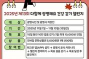(뉴스인020 = 김성길 기자) 광명시는 시민들의 건강한 생활습관 형성과 걷기 문화 확산을 위해 ‘제13회 다함께 광명해요 건강 걷기 챌린지’를 진행한다. 이번 챌린지는 오는 11월 1일부터 15일까지 15일간 열리며, 광명시민과 광명시에 소재한 직장인이면 누구나 참여할 수 있다. 참가자는 기간 동안 총 10만 보를 걸으면 되며, 1일 최대 1만 보까지만 인정된다. 참여 방법은 간단하다. 10월 29일부터 워크온(WalkOn) 앱을 설치하고 광명시 공식 커뮤니티에 가입한 뒤 ‘제13회 건강 걷기 챌린지 참여하기’를 눌러 걷기를 시작하면 된다. 단, 목표 걸음을 달성한 시민은 ‘응모하기’ 버튼을 눌러 참여를 완료하면 된다. 누적 걸음 수 목표를 달성한 참여자 중 추첨으로 100명에게 모바일 문화상품권 5천 원권 1매를 지급한다. 당첨자 발표와 상품 지급은 11월 17일부터 11월 21일까지 진행할 예정이다. 나기효 건강위생과장은 “매회 많은 시민이 참여하는 ‘다함께 광명해요 건강 걷기 챌린지’는 일상 속 건강한 습관을 형성할 좋은 기회다”며 “시민들이 걷기를 통해 건강도 챙기고, 작은 선