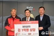 (뉴스인020 = 김성길 기자) 충남도는 대천김으로부터 1억원 상당의 김을 기탁받았다고 27일 밝혔다. 이날 도지사 외부접견실에서 열린 전달식에는 김태흠 지사를 비롯해 최민순 대천김 총괄대표, 성우종 충남사회복지공동모금회장 등이 참석해 나눔의 의미를 함께했다. 이번에 기탁된 김은 충남사회복지공동모금회를 통해 경제적 어려움을 겪고 있는 이웃들에게 전달될 예정이다. 김 지사는 “지역 기업의 따뜻한 나눔이 취약계층에게 큰 위로와 도움이 될 것”이라며 “기탁된 물품을 꼭 필요한 분들께 전달하겠다”고 말했다. 최민순 총괄대표는 “지역사회와 함께 성장해온 기업으로서 어려운 이웃에게 조금이나마 보탬이 되고자 했다”며 “앞으로도 지속적인 나눔을 통해 사회적 책임을 다하겠다”고 답했다.