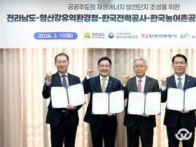 (뉴스인020 = 김성길 기자) 전라남도는 10일 한국전력공사 회의실에서 한국전력, 한국농어촌공사, 영산강유역환경청과 공공 주도 재생에너지 발전단지 조성과 안정적 전력 공급을 위한 업무협약을 했다. 협약식에는 강위원 전남도 경제부지사, 김동철 한국전력 사장, 김인중 한국농어촌공사 사장, 김영식 영산강유역환경청장 직무대리 등 관계자가 참석했다. 협약은 기존 민간 주도 개발 방식에서 벗어나 입지 발굴부터 계통 연계, 환경 보전, 주민 수용성 확보까지 모든 과정에서 공공기관이 협력해 재생에너지 발전단지를 조성하기 위한 것이다. 전남도는 사업 발굴과 계획 수립, 주민 수용성 확보 등 행정 지원을 맡고, 영산강유역환경청은 규제와 제도 개선 지원, 환경성을 고려한 전력망 확충 지원 등에 나서며, 한국전력은 재생에너지 안정적 공급을 위한 변전소와 송전선로 적기 건설을 추진하고, 한국농어촌공사는 농업기반시설을 활용한 단지 조성을 지원하는데 협력하기로 했다. 전남은 풍부한 재생에너지 자원을 보유하고 있음에도 계통 접속, 대규모 부지 확보, 환경성 검토 등 풀어야 할 과제가 많다. 또한 그동안 재생에너지 발전이 민간