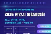 (뉴스인020 = 김성길 기자) 천안시는 오는 24일 천안과학산업진흥원과 함께 천안SB플라자에서 ‘중소기업 지원 및 과학기술사업화를 위한 2026 천안시 통합설명회’를 개최한다고 11일 밝혔다. 이번 설명회는 시와 관련된 기관·단체에서 추진하는 중소기업 지원사업에 대한 종합정보를 제공하고, 과학기술사업화 유관기관의 지원사업을 안내하기 위해 마련됐다. 설명회에는 중소기업 지원, 연구개발(R&D), 금융·보증, 기술사업화, 투자 분야의 공공기관 , 연구기관 등 22개 기관이 참여하며, 주요 정책 발표와 1:1 상담 부스 등을 통해 맞춤형 정보를 제공할 예정이다. 시 관계자는 “이번 설명회를 통해 중소기업들이 다양한 지원제도를 효율적으로 제공받을 수 있길 바란다”고 말했다.