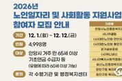 (뉴스인020 = 김성길 기자) 안양시가 1일부터 12일까지 건강하고 활기찬 노후를 위한 ‘2026년 노인일자리 및 사회활동 지원사업’의 참여자 4,998명을 모집한다. 참여자 규모는 유형별로 ▲노인공익활동 3,155명 ▲노인역량활용 1,106명 ▲공동체사업단 574명 ▲취업지원 163명 등이다. 노인일자리사업의 수행기관은 ▲안양시노인종합복지관 ▲비산노인종합복지관 ▲안양시니어클럽 ▲만안·동안노인지회 ▲경기실버포럼 ▲(사)위니버스 ▲시니어복지사회적협동조합 ▲만안구청 ▲동안구청 등 10곳이며, 참여자는 수행기관에서 추진하는 다양한 일자리·사회활동에 참여하게 된다. 신청 자격은 공고일(11월 27일) 기준 안양시에 주민등록이 되어 있는 어르신이다. 세부 기준은 ▲노인공익활동은 65세 이상 기초연금·직역연금 수급자(배우자 포함) ▲노인역량활용은 65세 이상(일부 유형은 60세 이상) ▲공동체사업·취업지원은 60세 이상이다. 다만, 생계급여 수급자(취업지원 제외), 건강보험 직장가입자, 장기요양등급자 등 일부 대상자는 신청이 제한된다. 희망자는 신분증과 주민등록등본 등을 지참하고 해당 수행기관