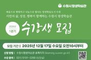 (뉴스인020 = 기자) 수원시평생학습관이 12월 17일 오전 10시부터 2026년 1분기 수강생을 모집한다. 1월부터 3월까지 운영되는 1분기 강좌는 ▲첨단미래기술 프로그램 ▲디지털 지식정보 프로그램 ▲생활문화 프로그램 ▲교양 프로그램 ▲인문 프로그램 ▲기관 협력 재능기부 프로그램 ▲거북이공방 프로그램 ▲대상별 맞춤프로그램 ▲시민교육 프로그램 ▲언제든학교 시민기획 프로그램 ▲무지한스승의만남 시민참여기획 프로그램 등 총 11개 과정, 115개 세부 강좌로 구성됐다. 첨단미래 기술 프로그램을 강화했다. 인공지능(AI) 기술에 초점을 둔 첨단미래기술 프로그램, 성균관대학교 지능로봇리빙랩과의 협업을 통한 자율주행 실습, 가상현실(VR)드론 시뮬레이션 체험 등이 있다. 또 글쓰기, 사주명리학, 한글 서예, 현대미술, 명화감상, 뮤지컬 등을 주제로 한 교양 프로그램과 중장년, 시니어, 제2의 인생설계, 청소년 등을 대상으로 하는 대상별 맞춤 프로그램을 마련했다. 수원시는 새빛톡톡 시민 설문조사를 활용해 2026년 강사를 공개 모집했고, ▲생활문화 프로그램 ▲디지털 지식정보 프로그램 ▲대상별 맞춤프로그램