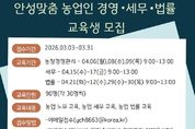 (뉴스인020 = 김성길 기자) 안성시농업기술센터가 지역 농업인의 안정적인 영농 활동을 돕기 위해 오는 31일까지 ‘안성맞춤 농업인 경영·세무·법률 교육’ 교육생을 모집한다. 이번 교육은 전문가 특강을 통해 농가 운영 중 발생할 수 있는 경영적, 법적 문제를 사전에 예방하고 해결할 수 있는 역량을 키워주기 위해 마련됐다. 교육은 오는 4월 6일부터 30일까지 주제별 지정된 날짜에 진행된다. 모집 분야는 ▲농업 경영 ▲농업 세무 ▲농업 법률 등 3개 과정이며, 분야별로 30명씩 총 90명을 선발한다. 신청 인원이 초과할 경우 내부 선발 기준에 따라 교육생을 최종 선정할 예정이다. 신청 자격은 농업 경영에 관심 있는 안성시민이라면 누구나 가능하며, 접수는 3월 31일까지다. 참여를 희망하는 시민은 이메일을 보내거나 농업기술센터 농업지도과(보개원삼로 219)를 방문해 신청하면 된다. 시 관계자는 “농업인의 눈높이에 맞춘 경영·법률·세무 전문가 특강이 농가 역량을 강화하는 좋은 기회가 될 것”이라며, “안성 농업의 내실을 다지고 싶은 시민 여러분의 많은 관심과 참여를 바란다”고 말했다.