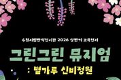 (뉴스인020 = 김성길 기자) 경기도 수원시립미술관은 자연과의 관계를 성찰하고 생태적 가치를 체험하는 참여형 교육전시 《그린그린 뮤지엄 : 별가루 신비정원》을 3월 24일부터 7월 24일까지 수원시립만석전시관에서 개최한다. 《그린그린 뮤지엄》은‘자연과의 눈맞춤’을 주제로 자연의 초록(Green) 빛을 예술로 그려낸다(Drawing)는 중의적 의미를 담아 연간으로 운영된다. 2026년 상ㆍ하반기 두 차례에 걸쳐 운영되며, 상반기 1부 전시는《그린그린 뮤지엄: 별가루 신비정원》에 이어 하반기에는 새로운 주제의 2부 전시가 이어질 예정이다. 이번 전시는 회화 작가 진영(b.1982)과 설치, 사운드 등 융복합 작업을 선보이는 팀 아르테코(est.2023, 설혜린, 이소희, 김창수, 드림스케이프)가 참여한다. 전시는 총 20점의 작품으로 구성되며, 두 개의 섹션을 통해 자연을 감각하고 사유하는 경험을 제공한다. 첫 번째 섹션 '어두운 밤, 숲의 이야기'는 앵무새를 매개로 숲의 서사를 그려내는 작가 진영의 작품을 소개한다. 클로드 모네의 '수련이 있는 연'을 오마주한 작업 '사이 02'(2024)는 도시 속 유일한 쉼