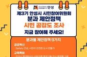 (뉴스인020 = 김성길 기자) 안성시는 오는 18일 오후 6시까지 시민참여위원회 분과별 제안 정책에 대한 시민 의견을 수렴한다고 밝혔다. 이번 시민 의견 수렴은 시민참여위원회 정책 발표회를 앞두고 진행하는 사전심사로, 분과별 제안 정책에 대한 시민 공감도를 확인하여 추후 현장심사 결과와 함께 최종 우수 제안 정책을 선정하는 데 활용된다. 7개 분과로 구성된 안성시 시민참여위원회는 소속 위원의 다양한 경험과 지속적인 논의를 바탕으로 안성시 시정에 반영할 정책 연구 활동을 추진해 왔으며, 이달 정책 발표회를 통해 각 분과에서 도출한 정책을 제안하여 그간 활동의 결실을 맺을 예정이다. 정책 발표회를 통해 각 분과에서 제안할 정책 주제는 ▲Safety 안성, 시민이 안전한 도시 만들기(공공혁신분과) ▲안성시 평생학습도시에 따른 평생교육 강사 플랫폼 구축(교육특화분과) ▲안성시 한우산업 탄소중립 모니터링 시스템 구축(미래농업분과) ▲안성시민을 위한 태양광발전 5개년 계획(생태도시분과) ▲전통문화 예술인들을 위한 창작공간 확보(문화도시분과) ▲안성, 사랑 흔들바위 관광지 조성(문화도시분과) ▲더불어 이동하는 자유로운 안
