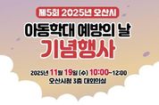 (뉴스인020 = 김성길 기자) 오산시는 오는 19일 ‘아동학대예방의 날’과 ‘아동학대예방주간’을 맞아 기념행사 및 온·오프라인 캠페인을 실시한다고 12일 밝혔다. 행사는 19일 오전 10시부터 12시까지 오산시청 대회의실에서 진행되며, ▲1부 아동학대예방의 날 기념식 식전공연, 유공자 표창 시상, 퍼포먼스, ▲2부 부모교육 특별강연으로 구성된다. 특별강연은 리플러스 인간연구소 박재연 소장이 ‘부모를 위한 건강한 대화방법’을 주제로 진행한다. 매년 11월 19일은 아동학대 예방과 방지에 대한 사회적 관심을 높이기 위해 제정된 법정기념일로, 오산시는 매년 기념식과 강연, 캠페인 등을 통해 아동학대 예방의 중요성을 알리는 다양한 활동을 추진해오고 있다. 시는 이달 25일까지 온라인 릴레이 캠페인도 함께 진행한다. 오산시민 누구나 SNS에 아동학대예방 메시지 또는 관련 사진을 업로드해 참여할 수 있다. 또한 11월 24일에는 시청 인근 주요 교차로에서 시민 대상 오프라인 홍보 캠페인을 실시해 아동학대 예방 인식 제고에 나설 예정이다. 박현주 아동복지과장은 “이번 행사가 아동학대 예방의 중요성을 되새기고