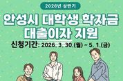 (뉴스인020 = 김성길 기자) 안성시는 대학생 및 대학원생들의 교육비 부담을 덜어주기 위해 ‘2026년 상반기 대학생 학자금 대출이자 지원사업’을 시행한다고 밝혔다. 지원 대상은 공고일(2026. 3. 24.)기준으로 안성시에 주소를 두고 있는 대학생 및 대학원생(휴학생 포함)이다. 신청 기간은 3월 30일부터 5월 1일까지이며, 신청을 희망하는 학생은 주소지 읍·면·동 행정복지센터 또는 안성시청(미래교육과)를 방문하여 신청서와 구비서류(주민등록등본, 재학증명서)를 제출하면 된다. 지원 대상자로 선정되면 대상자가 한국장학재단에서 대출받은 학자금에 대한 2025년 하반기(7월~12월) 발생 이자를 안성시가 지급하게 된다. 지급은 대출 계좌 원리금에서 차감하는 방식으로 진행되며, 지원 결과발표 및 이자는 오는 6월 지급 예정이며, 확정된 시점에 한국장학재단 인터넷 홈페이지 및 고객센터에서 확인할 수 있다. 안성시 관계자는 “학자금 대출이자 지원사업을 통해 대학생들의 학업 부담을 완화하고, 학업에 전념할 수 있는 환경을 조성하는 데 도움이 되길 바란다”고 말했다.